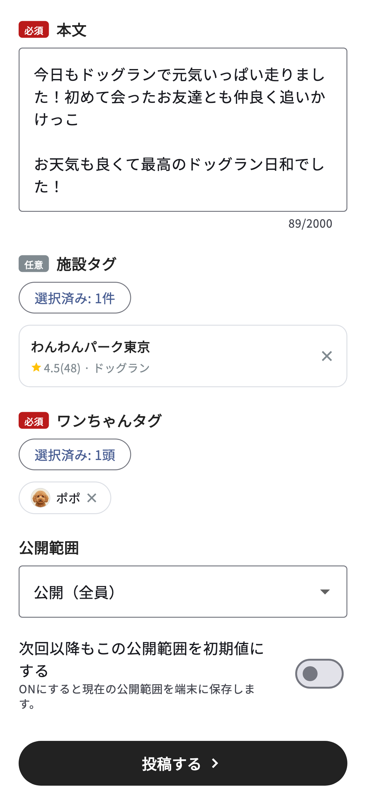タグ付けして“公開”にて投稿